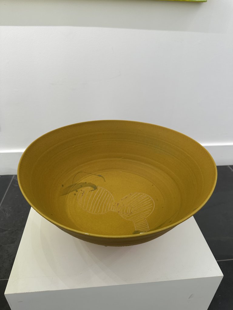 Right after breakfast, Kayo finds himself in his potter shed – his happy place – until 5 pm each day. And once in a while, he has the urge to pick up a paint brush and express himself on a large scale canvas that complements his pottery so well.